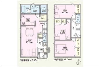 | 設備 | 温水洗浄便座、トイレ2ヶ所、浴室乾燥機、システムキッチン、カウンターキッチン、IHクッキングヒーター、浄水器、床下収納、複層ガラス、モニタ付インターホン、ディンプルキー、駐車場2台分、[火災警報器等設置済] | ||
